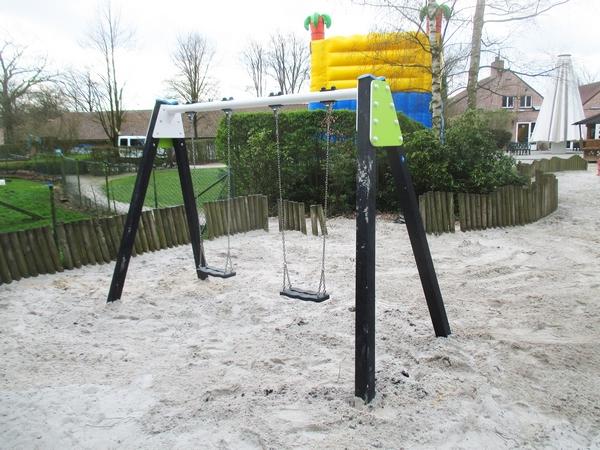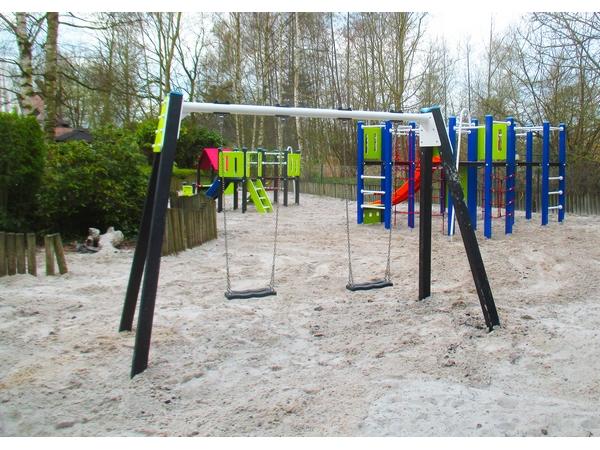 - Matériaux : Structure en plastique recyclé, poteaux recouverts de capuchons, plaques en HMPE colorée épaisseur 19mm, barre en aluminium revêtu en poudre, chaînes en acier inoxydables
