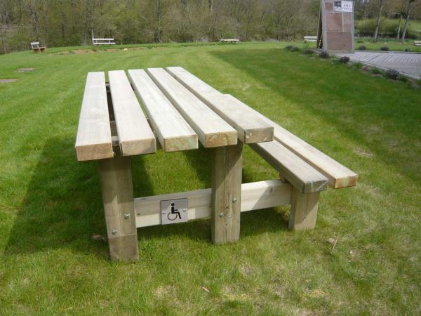 - Table en bois pin traité classe 4 avec un accès complet pour 2 fauteuils roulants sur toute la longueur de la table et un banc de l'autre coté