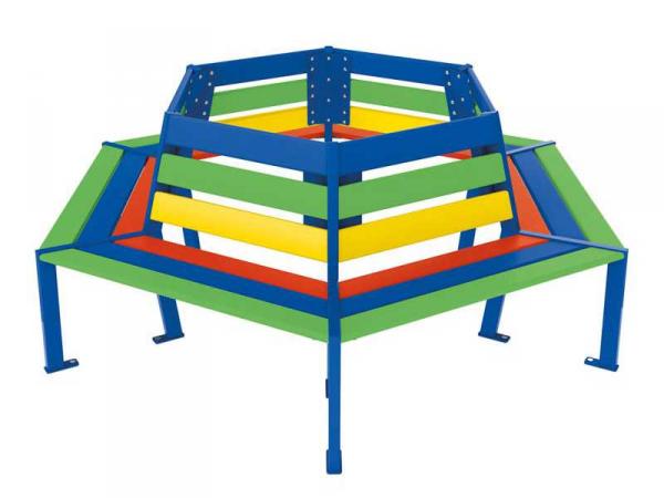 - Assise et dossier : bois exotique, finition laquée multicolore (RAL rouge 3020, jaune 1023, vert 6018, bleu 5010).