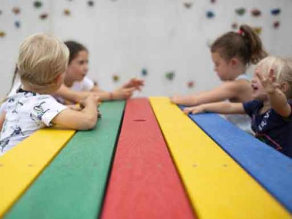 - Plateau et assises en lames multicolores : jaunes, bleues, vertes, rouges