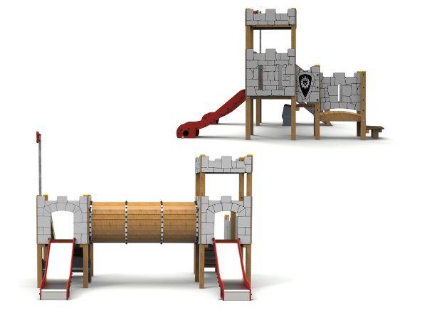 - Structure complète de la gamme château avec deux toboggans, 1 banc en dessous pour s'asseoir, 1 grand tunnel à ramper en bois cerclé en acier peint, 1 arc à grimper et 1 escalier