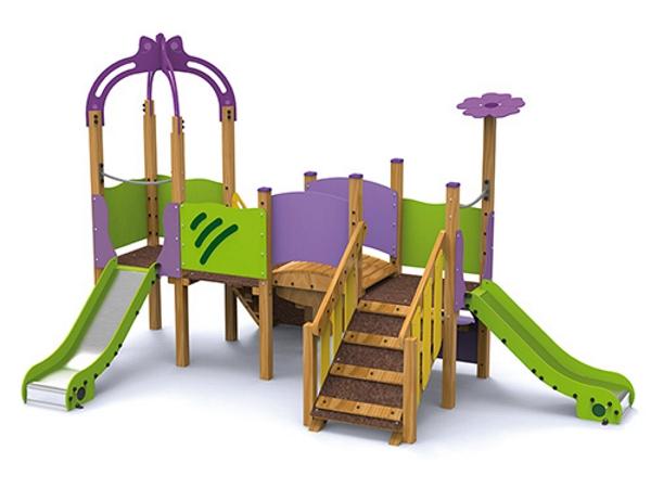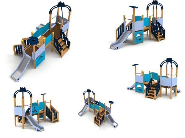- Cette structure copain est composée de 2 toboggans en inox, 1 tour avec un toit 4 arcs, une passerelle fixe avec des panneaux de protection pleins, 1 comptoir en dessous d'une des deux tours, 1 escalier