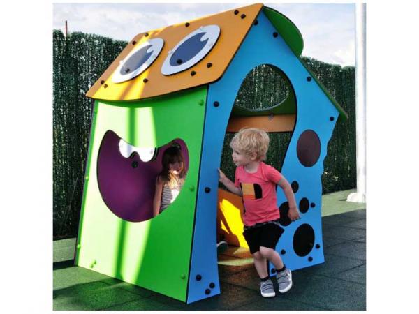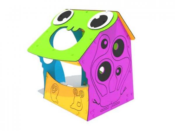 Cabane pour enfants avec fenêtres, sièges et décoration gravée