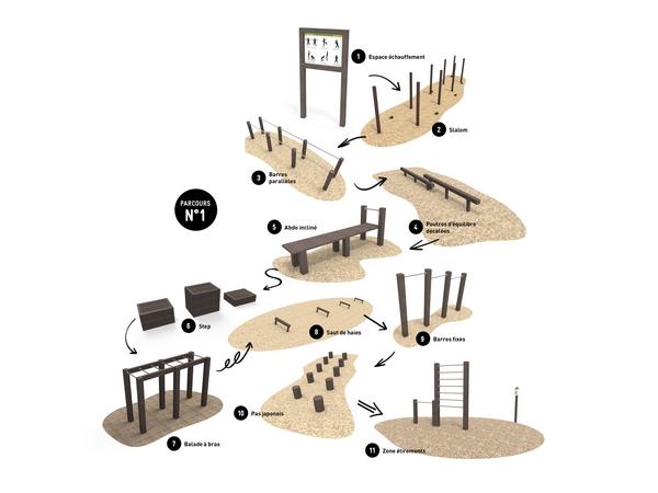 - Composition : Espace d'échauffement + slalom + barres parallèles + poutre d'équilibre décalées + abdo incliné + step + balade à bras + saut de haies + barres fixes + pas japonnais + zone d'étirement