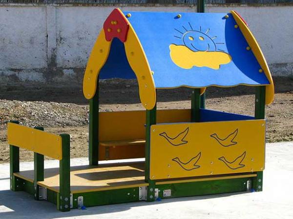 - Cabane toit 2 pans avec plancher équipée d'une table et de 2 banquettes intérieures et prolongée par une terrasse avec barrière