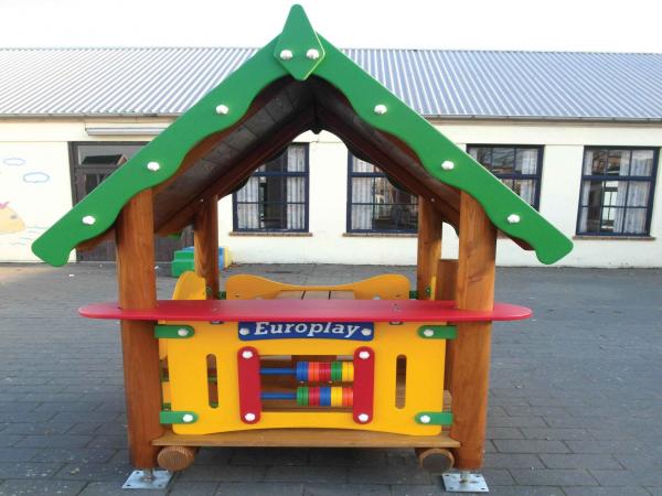 - Boutique sur plancher avec un toit à 2 pans, un comptoir à l'avant, une entrée sur le côté + 2 banquettes + 1 table à l'intérieur