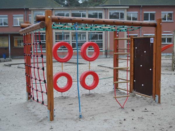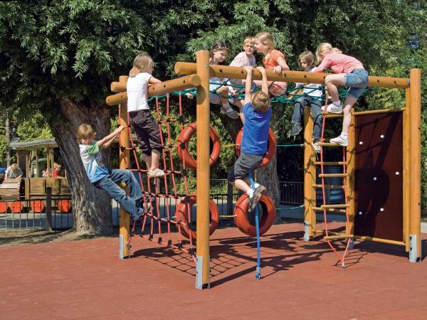 - Structure multi-jeux avec échelle fixe, échelle mobile (cordage), corde, filet à grimper, mur d'escalade, pneus d'escalade et hamac