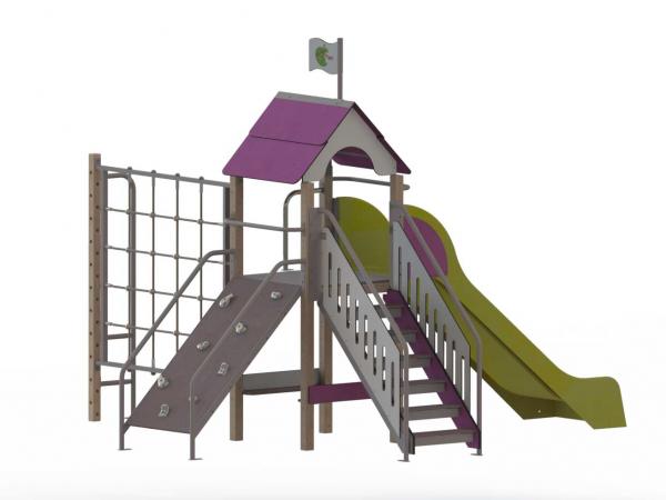 - Également composée d'un mur à grimper, d'un escalier, d'un filet d'assaut, d'une échelle facilitant l'accès au filet et d'un toboggan