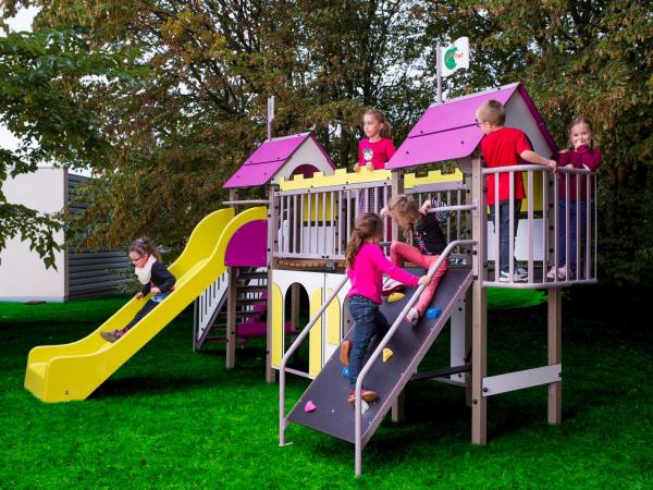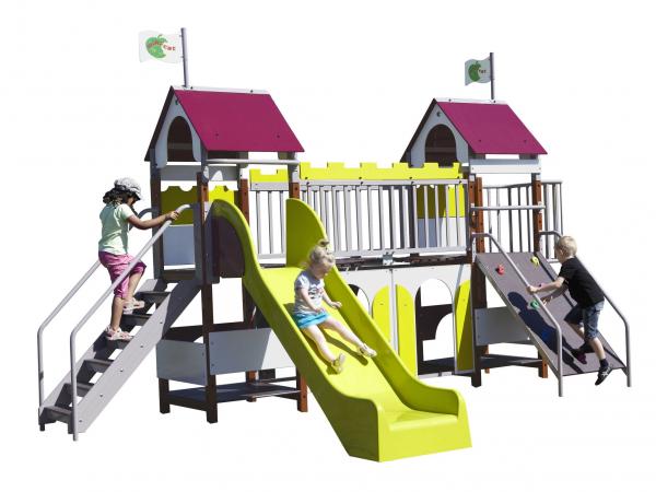 - Sur chaque tour, des agrès sont fixés : 1 maisonnette sous le passage, 1 mur à grimper, 1 toboggan polyester et 1 escalier