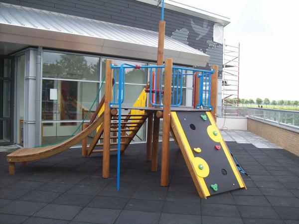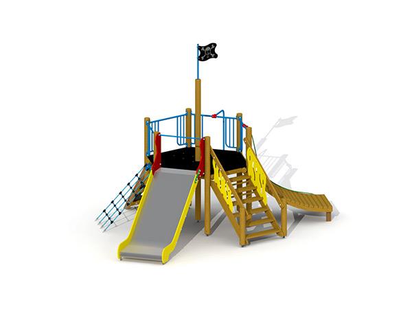 - Un escalier, un toboggan, un mur d'escalade, un filet incliné, un mât droit et un arc à grimper