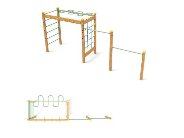 - Équipé de 2 barres fixes différentes hauteurs, 1 filet de grimpe, balade à bras...