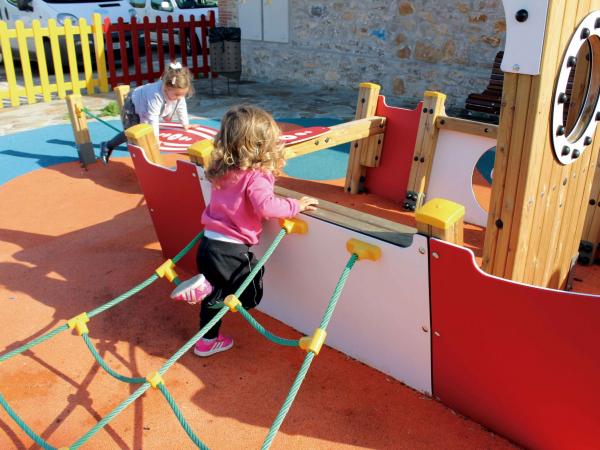 - 1 filet à grimper, des bancs pour s'asseoir dans le bateau et un hublot pour regarder au large