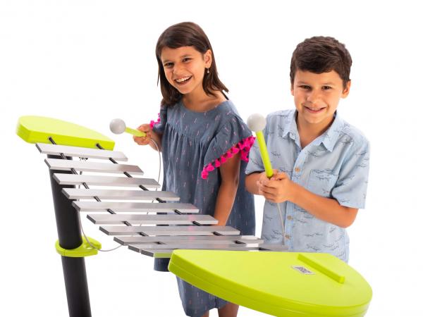 - Xylophone en acier et polyéthylène sur poteau avec deux baguettes sécurisées pour jouer du xylophone en extérieur