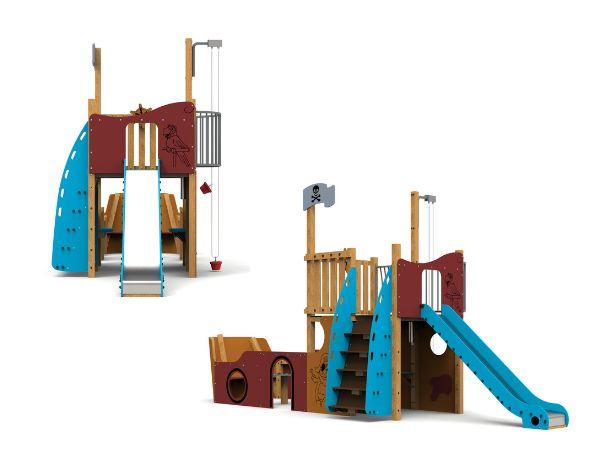 1 poste d'observation, gouvernail, échelle, ascenseur à panier avec tube, table à trémie, siège, jeu de compas et toboggan