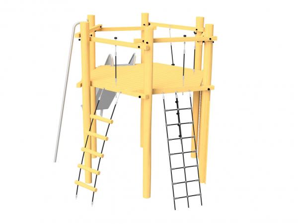 - Structure en robinier composée d'une plate forme, accessible par un filet à grimper, un mur à grimper, une corde d'escalade ou une échelle