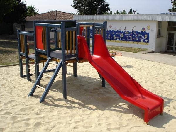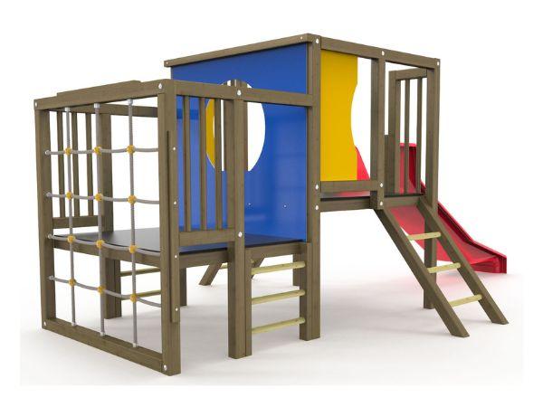 - Structure composée de 2 plate-formes antidérapantes de 700 et 900 mm de haut, d'un toboggan, de 2 échelles verticales, de 2 échelles inclinées et d'un filet à grimper