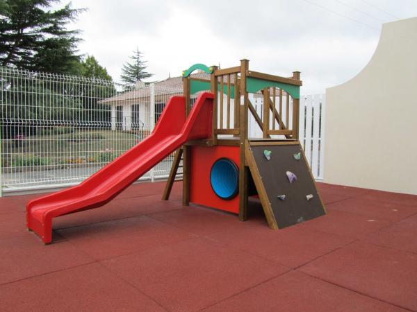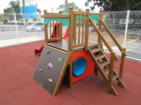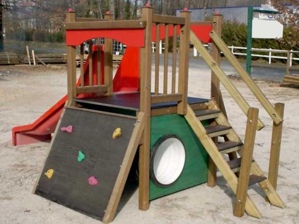 - Équipé d'un toboggan, d'un escalier, d'un mur d'escalade et d'un tunnel