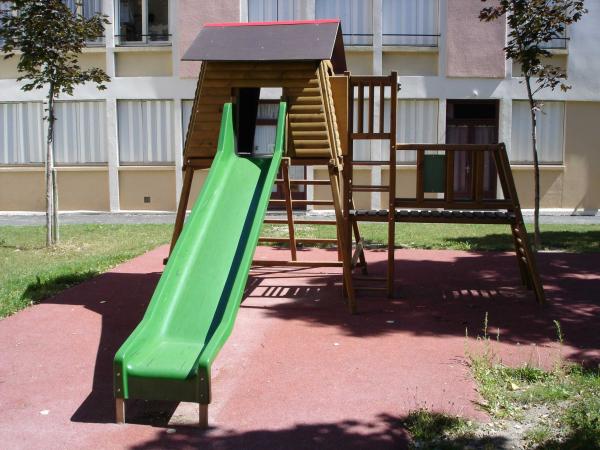 - Structure bois composée de 2 échelles, d'un pont rigide, d'une tour avec toiture 2 pans et de 1 toboggan