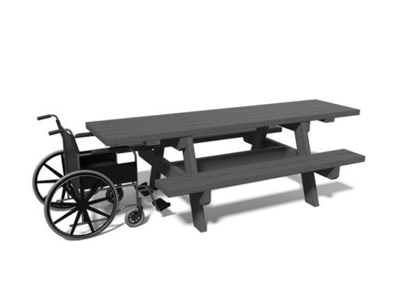 - Table pique-nique en plastique recyclé avec 2 banquettes + 2 espaces pour accueillir les fauteuils roulants