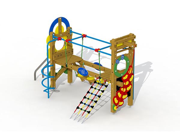 - DESCRIPTION : Structure passerelle à traverser pour les petits composée de 7 éléments de jeux (toboggan tuyaux à glissade, mât droit, mur d'escalade, filet à grimper, mât en spirale, poutre mobile et barres fixes)